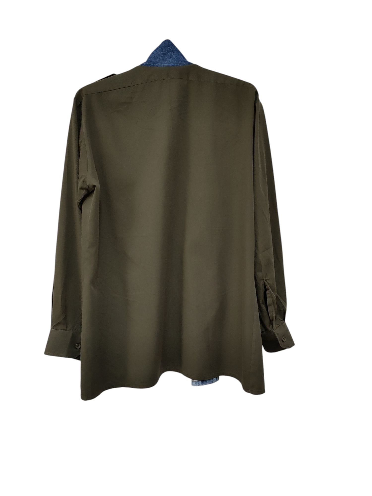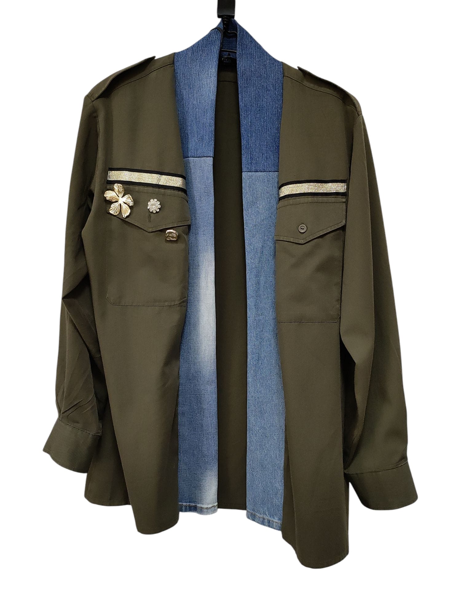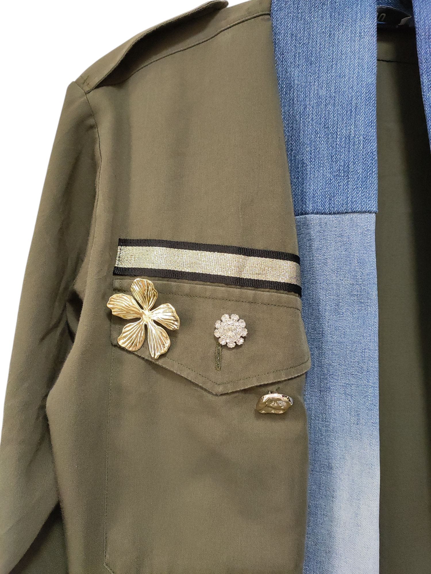 Giacca camicia in cotone con dettaglio collo in jeans sfumato. Applicazioni sui taschini.