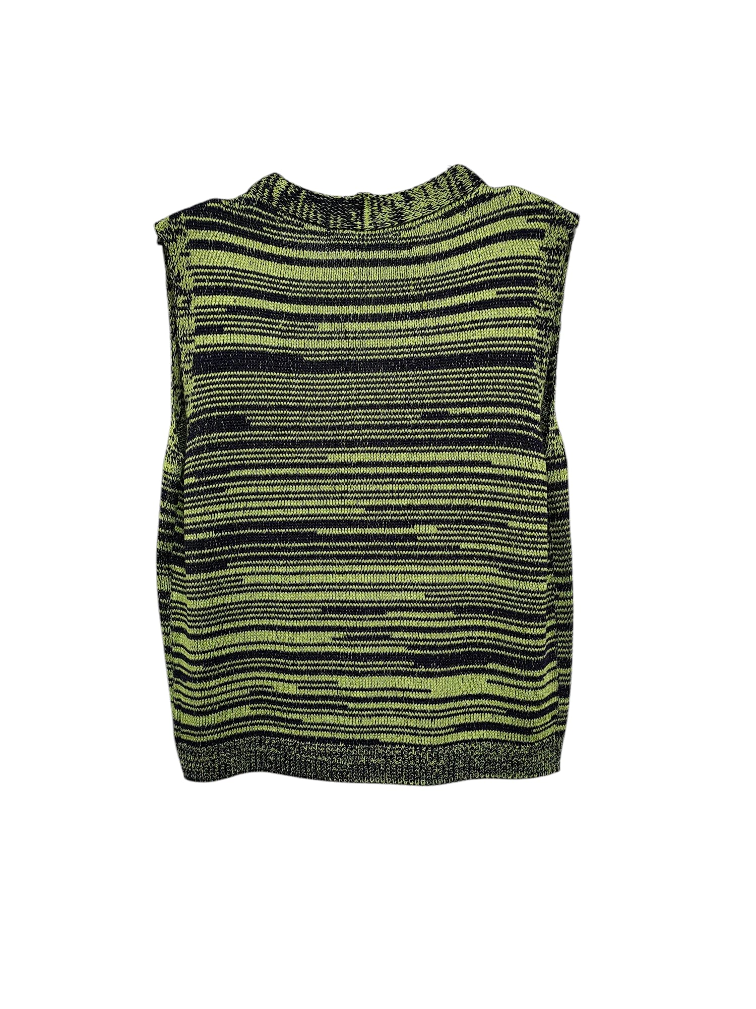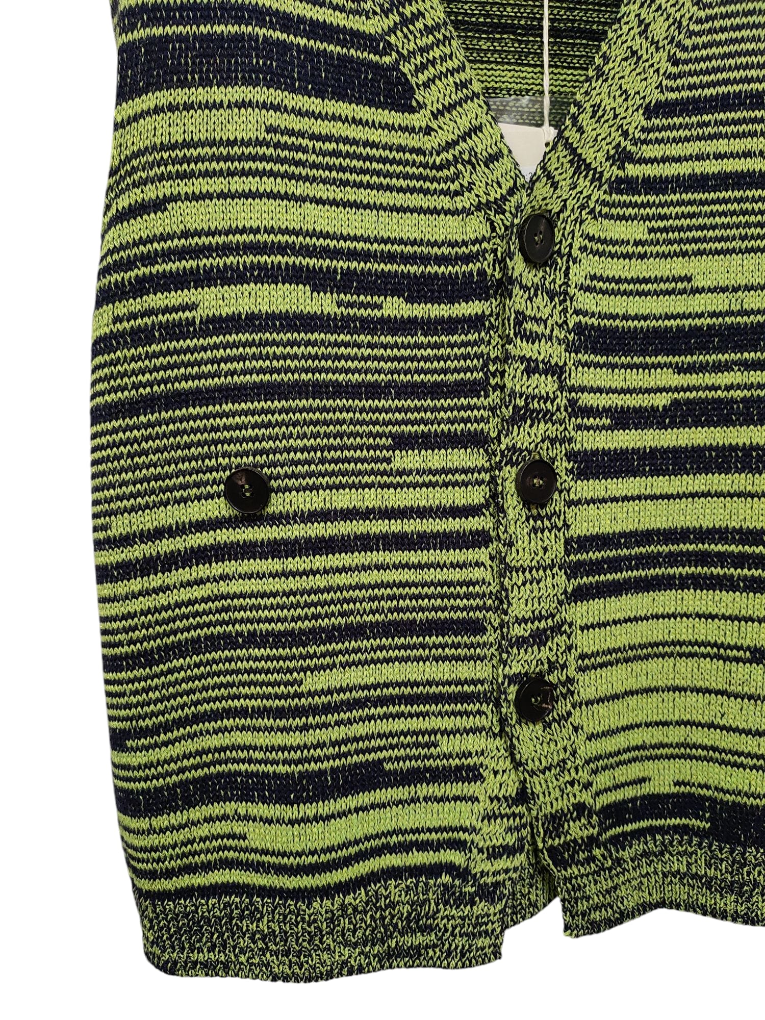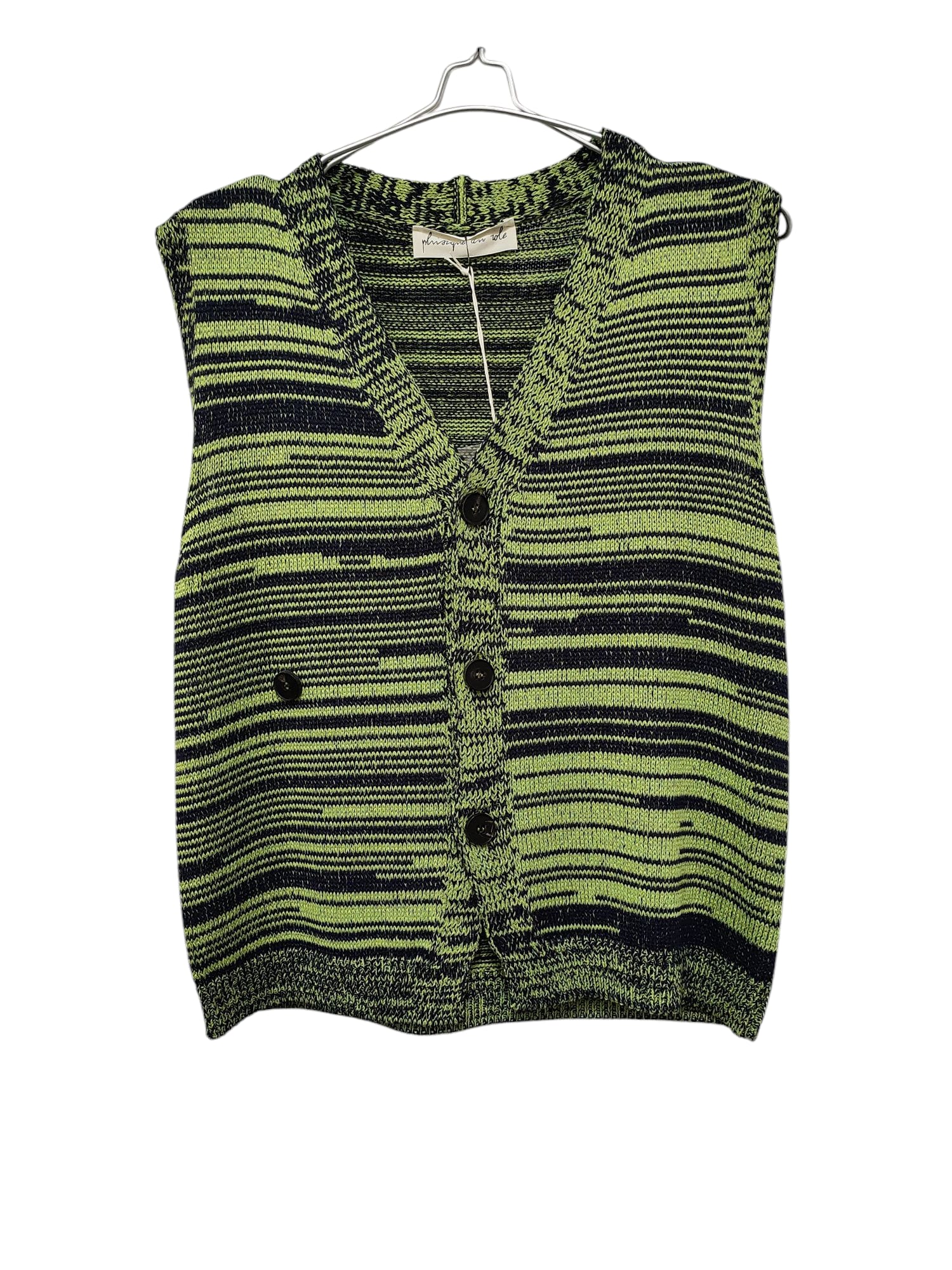 Gilet in filo rigato con lurex all'interno. Bottoncini davanti e bottone laterale per avvitare il capo.