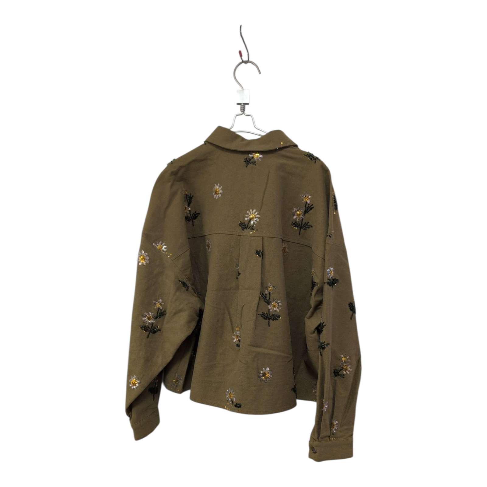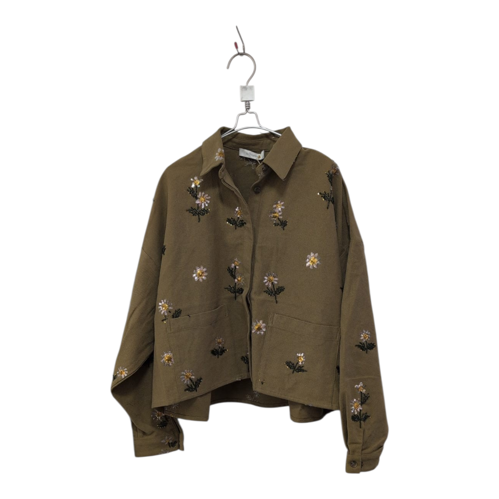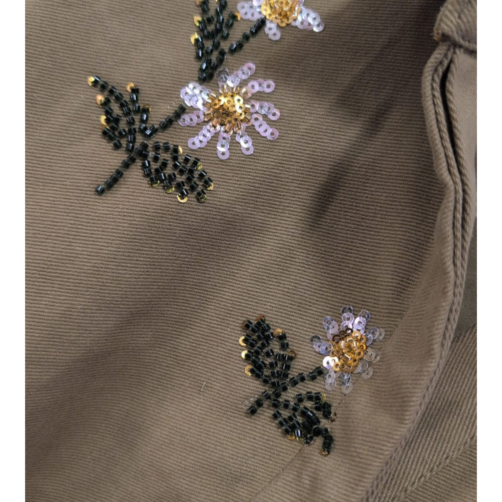 Caban in drill di cotone con ricami fiori realizzati in paillettes. Stile trendy e contemporaneo. Chiusura con bottoni. Piegone sulla schiena. Tasche davanti.