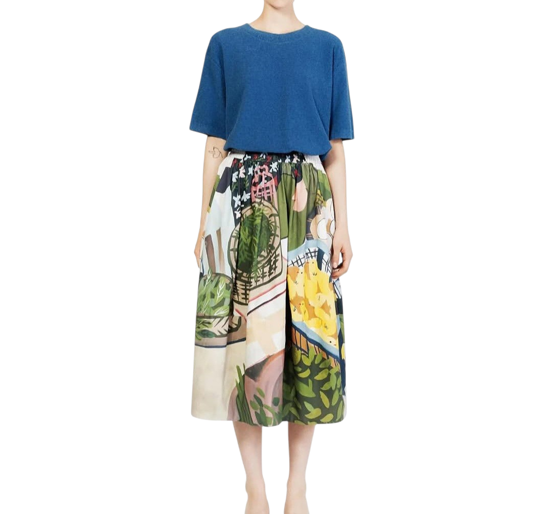 Gonna  con stampa esclusiva. Progetto "tracce di vita", indossata per durare. Una storia raccolta in varie parti del mondo e racchiuse in una stampa da indossare some gonna. Glamour, chic, unica. In questa versione si riprende uno scenario di SHANGHAI _ CHINA.  Realizzata in cotone con elastico in vita adatta a tutte le fisicità, tasche laterali. Taglie disponibili 1 (40-42) e 2 (44-46)