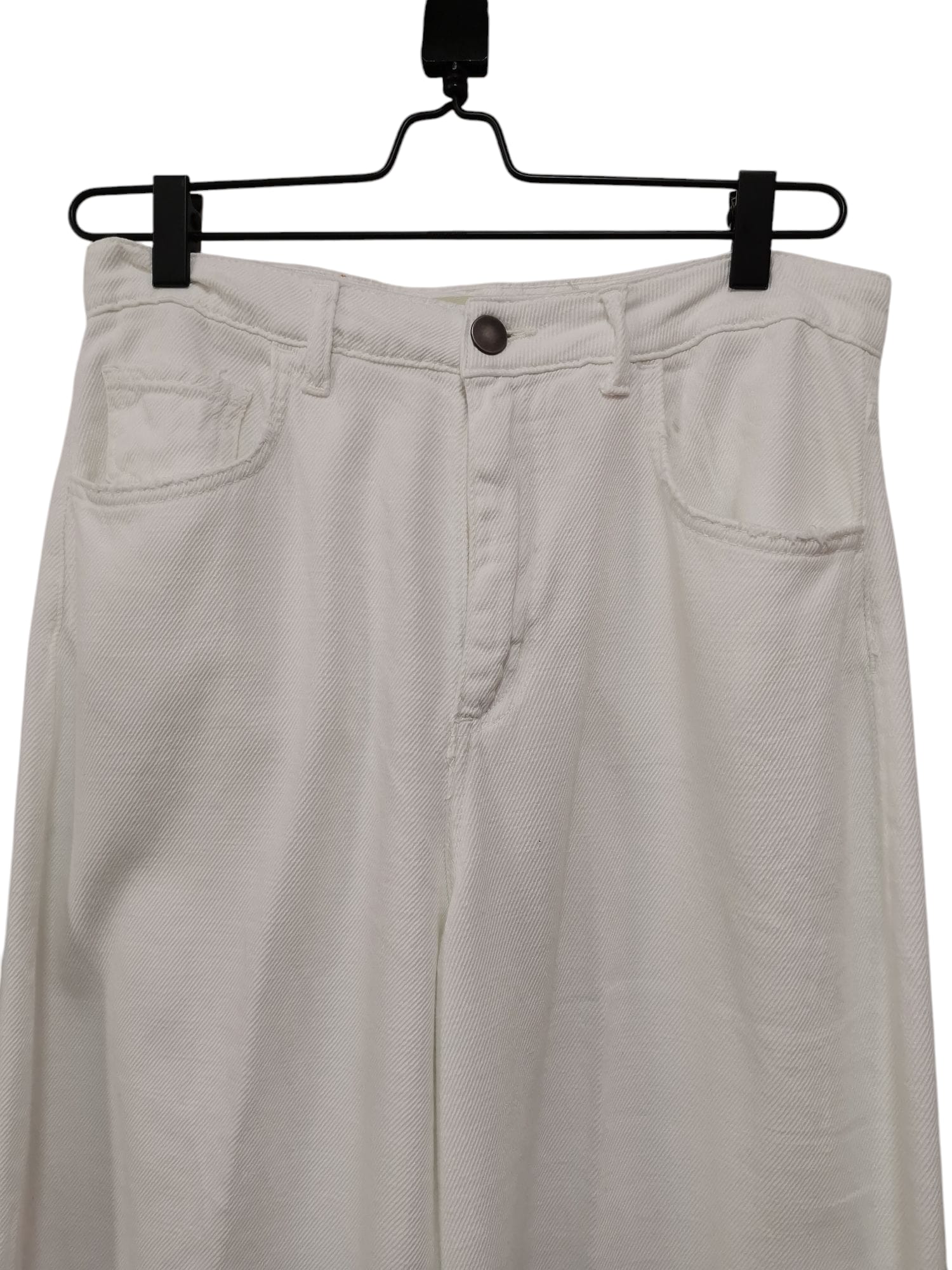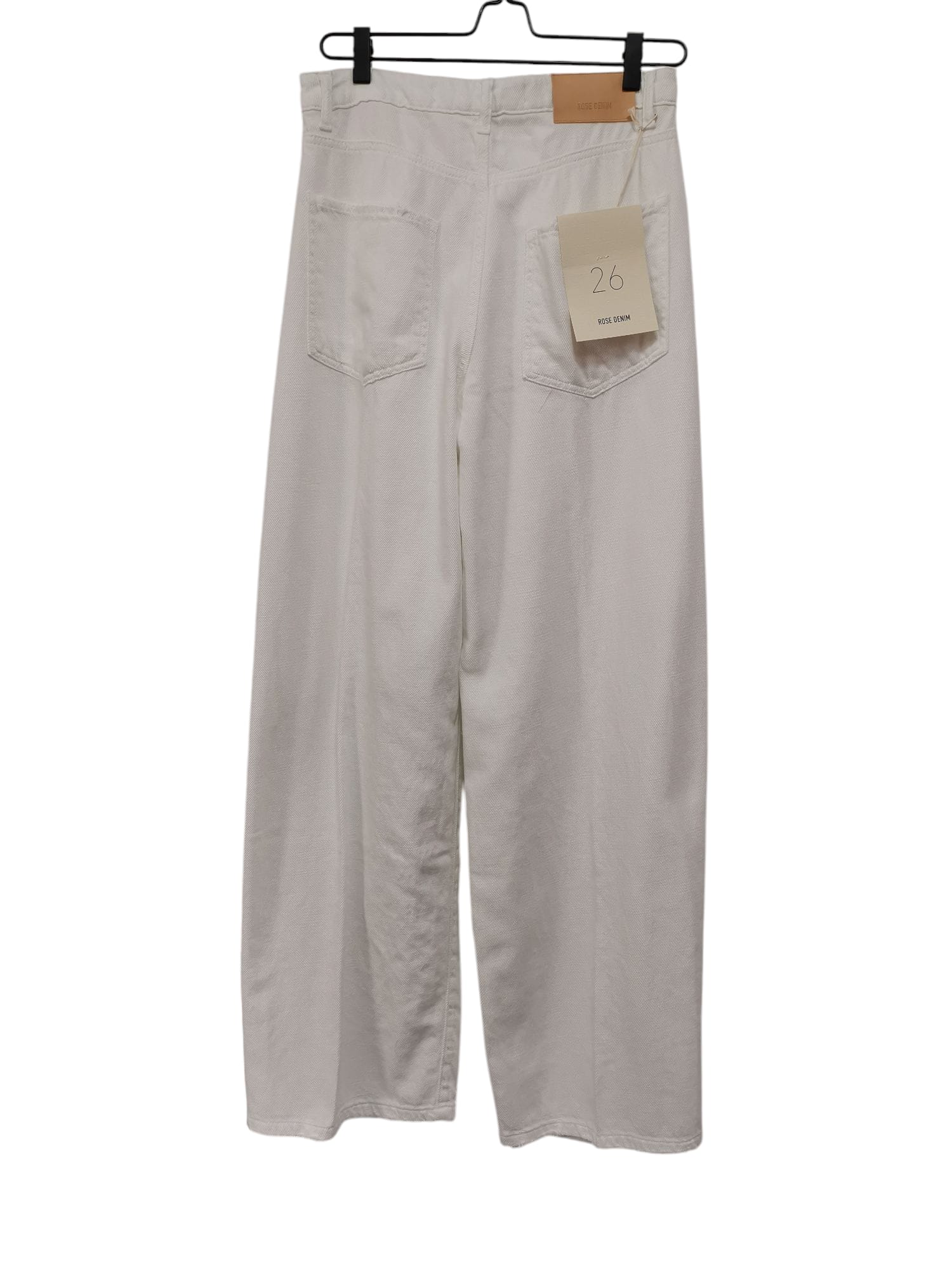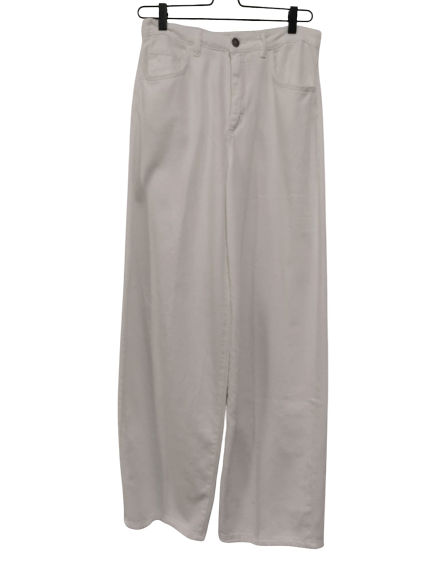 Pantalone in tela di jeans bianco. Modello 5 tasche con gamba a palazzo. Tela leggera.