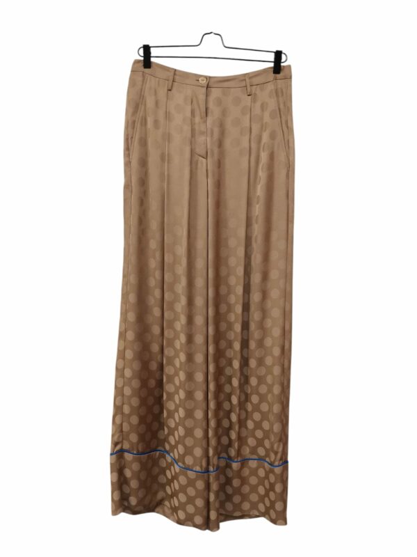 Pantalone palazzo modello pigiama in viscosa a pois. Cinturino e passanti. Pences e tasche laterali. Bordo turchese in contrasto al fondo.